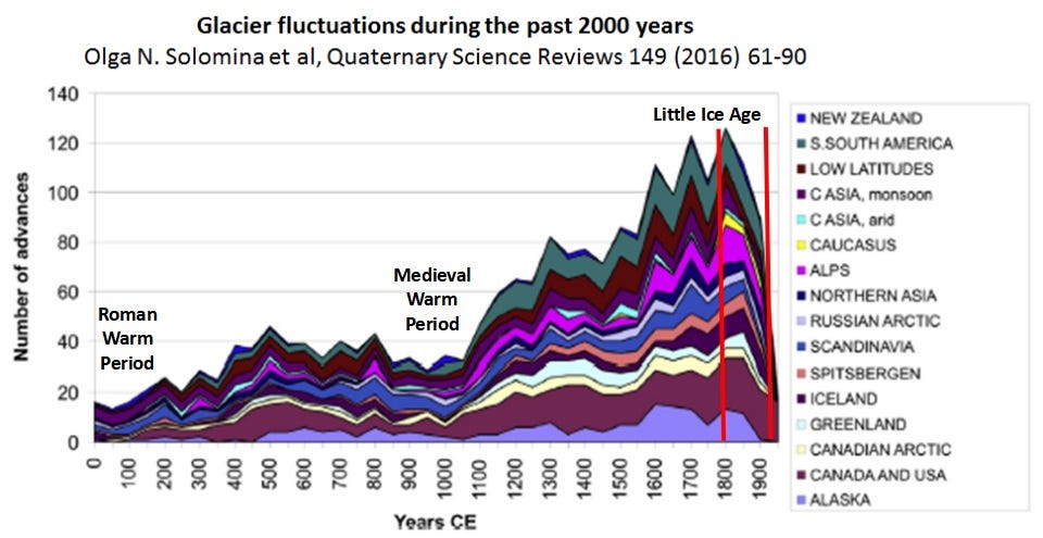Figure 2 shows the number of global glacier fluctuations over the past 2,000 years - note that I added the embedded text to highlight when the Roman (RWP) and Medieval (MWP) Warm Periods, together with the recent Little Ice Age (LIA) occurred. Note that while there was a gradual increase in the number of glacial advances between the RWP and MWP, there was a large increase for 800 years following the latter and an even larger decrease after glacial advances peaked during the LIA.