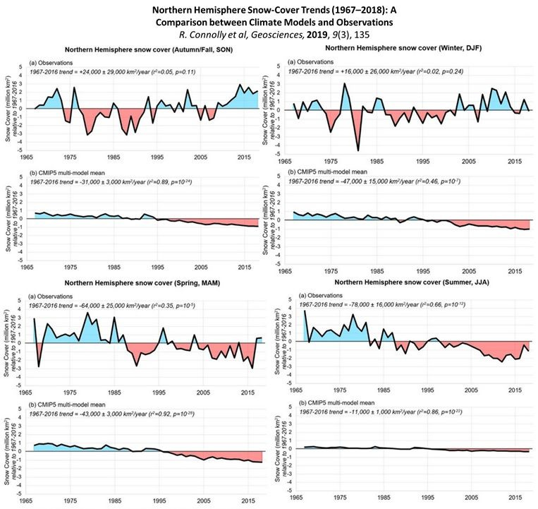 To further demonstrate the failure of models that claims human use of hydrocarbons is causative in altering the Northern Hemisphere cryosphere, I introduce recent work from R. Connolly et al, which compares changes in snow coverage by season (e.g., spring vs summer) versus what climate models predict when using rising CO2 as the causative agent. Note that Figure 8 shows that climate models (e.g., CMP5) predict a linear reduction in snow cover across the Northern Hemisphere, while observations show anything but a linear response.