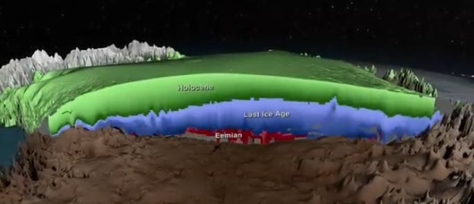 Exhibit A that kick starts this expose is the NASA’s extensive airborne ice penetrating radar study that peered deep inside Greenland’s ice sheets and produced a data-set that, like with the rings on a tree trunk, was used to generate a timeline that extends back over 130,000 years ago to the previous interglacial (warm) period called the Eemian. The residual Eemian ice (red) is shown in the cover image to exist along the ice field bottom, indicating that the previous interglacial period nearly melted all of Greenland’s ice fields.