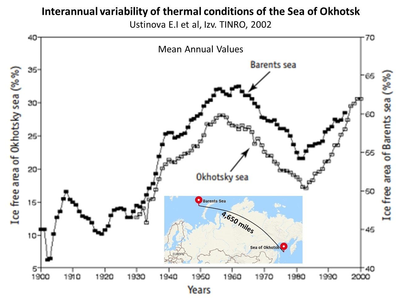 Figure 3. Changes in ice free area in the seas of Okhotsky and Barents over the 20th century.