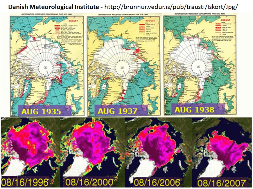 Figure 4. Changes in August extents of Arctic sea ice during the 1930s and late 20th - early 21st century.