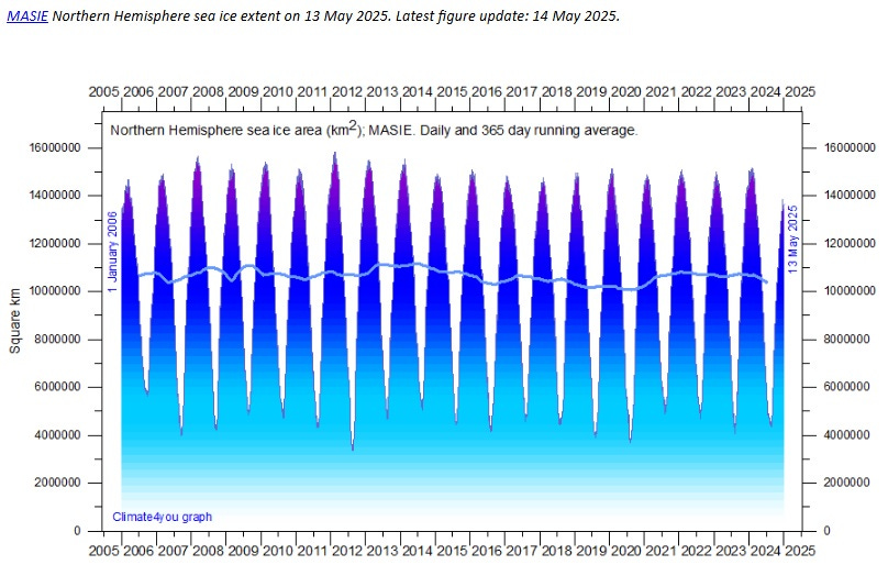 Figure 7. Daily extent of Northern Hemisphere sea ice - 2005 to 2025.