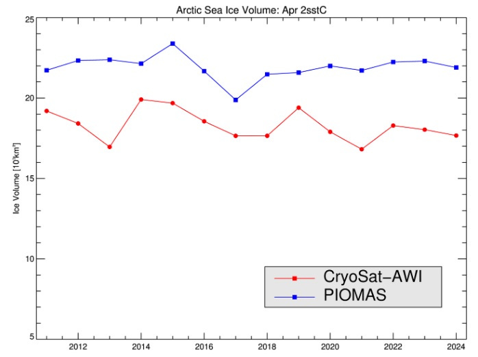 Figure 6. Two estimates of the volume of Arctic sea ice - 2011 to 2024.