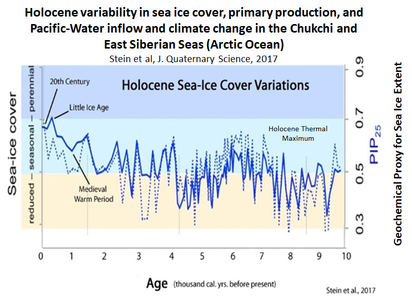 Next, I wish to bring into the light of day the pivotal work of Stein et al shown in Figure 1, which used geochemistry from ocean sediment collected in the Chukchi and East Siberian seas in the Arctic Ocean to serve as proxies of changes in summer season sea ice extent.