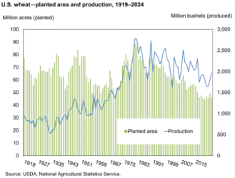 Figure 7. United States wheat production and cultivated land under wheat production.