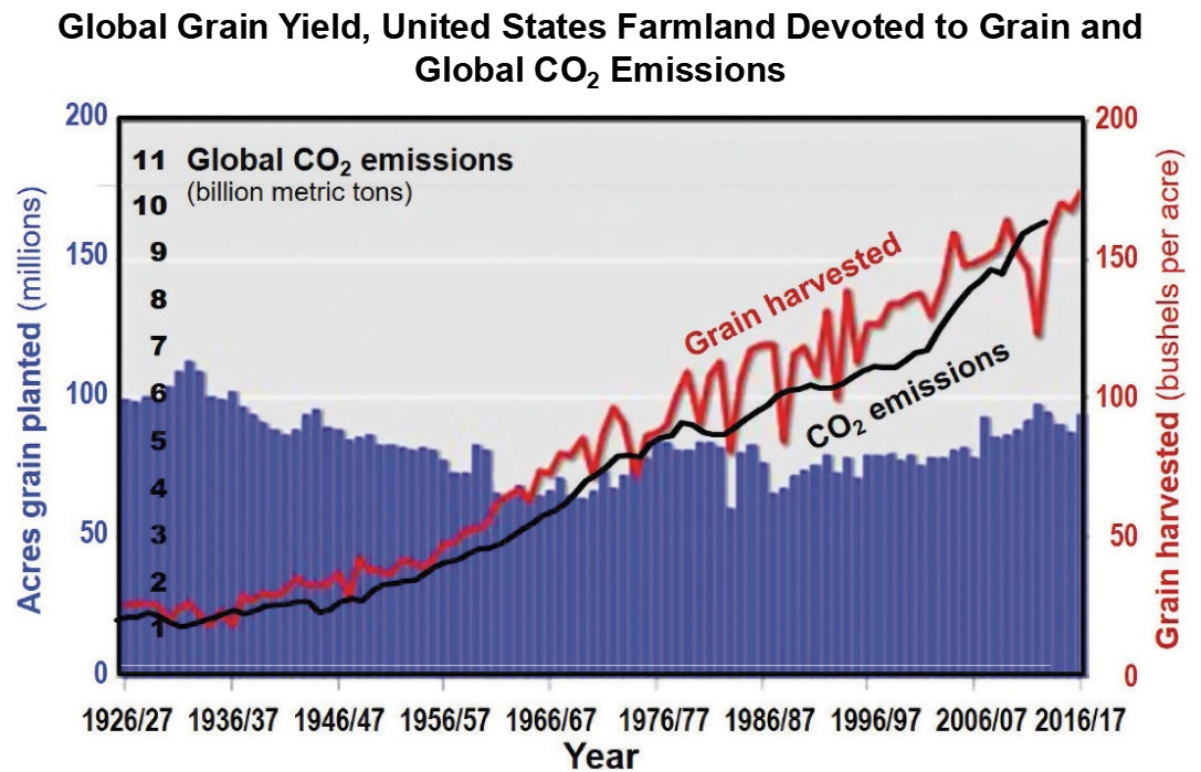 The positive impact of the Haber-Bosch process became widespread especially in the post WWII era and Figure 7 shows this influence on wheat production in the United States. Note that there is more than a 200 % increase in production by 2020 relative to 1920, yet land allocated to wheat production decreased by 20 million acres.